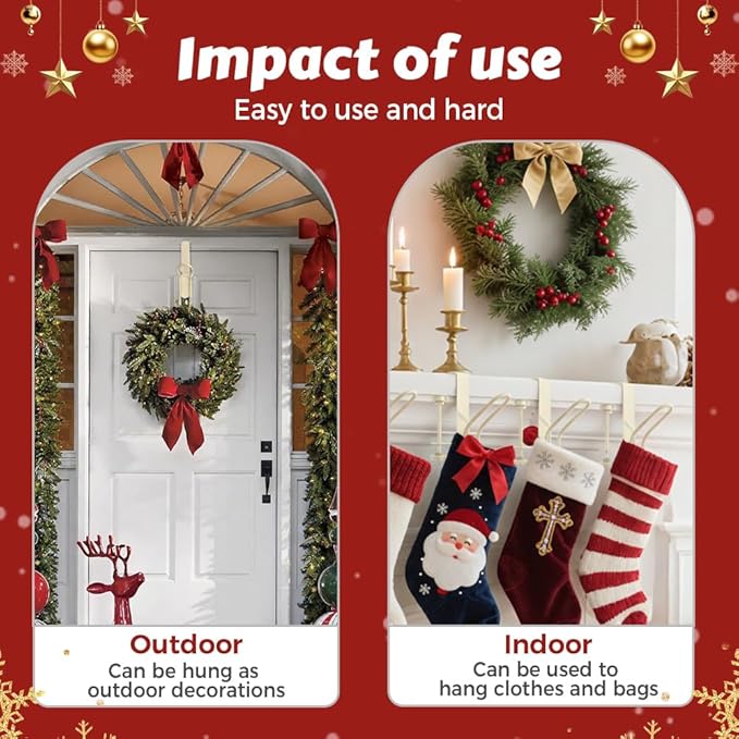 Innovative Double Hook Feature: The unique double hook design of our mantle garland hanger allows you to effortlessly hang both holiday wreaths and Christmas stockings simultaneously. This no-drill solution keeps your fireplace area tidy and enhances the overall festive atmosphere in your home.